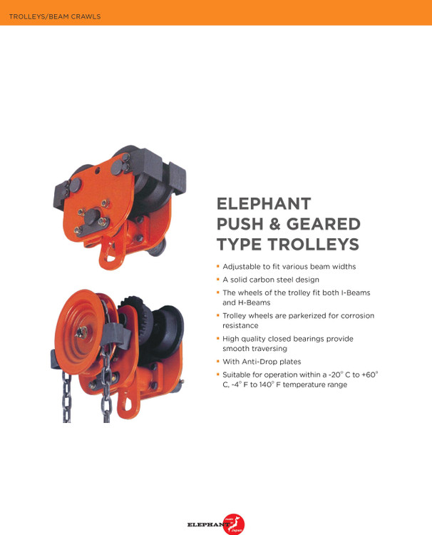 ترولی ساده دستی برای تناسب با عرض تیرهای مختلف قابل تنظیم هستند و دارای طراحی فولاد کربنی هستند. آنها دارای چرخ های پارکریزه برای مقاومت در برابر خوردگی و یاتاقان های بسته با کیفیت بالا برای عبور مستقیم هستند. آنها همچنین دارای صفحات ضد افت برای امنیت بیشتر هستند. آنها را می توان با برداشتن قلاب بالایی بالابر مستقیماً به بالابرهای دستی متصل کرد و در نتیجه فضای سر را کاهش داد.