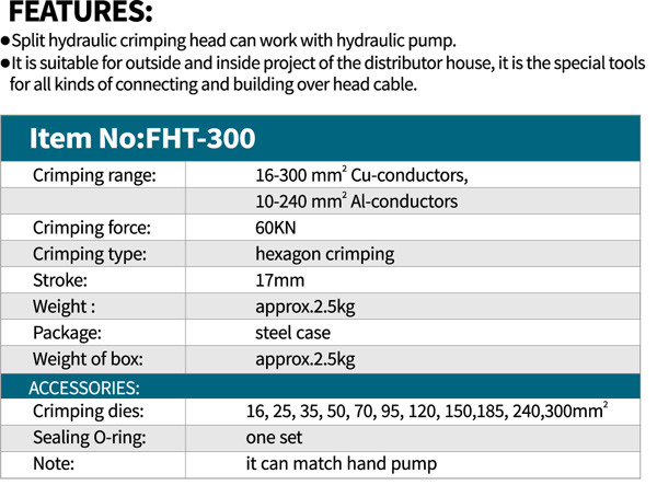 - مناسب برای پرس کابلشوهای مسی از سایز 16 الی 300 میلی متر مربع و کابلشوهای آلومینیومی از سایز 10 الی 240 میلیمتر مربع