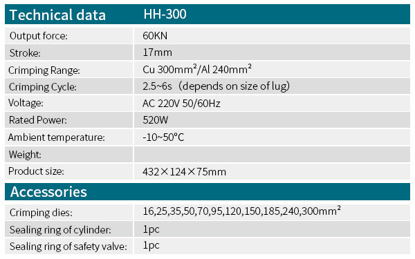 پرس کابلشو برقی با توان 520 وات و قدرت 60 کیلونیوتن مناسب برای پرس کابل های مسی تا سایز 300 و کابل های آلمینیوم تا سایز 240 میلیمتر با ولتاژ 220 ولت می باشد .