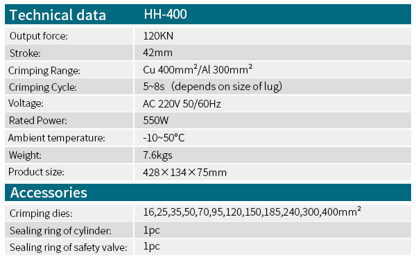 پرس کابلشو برقی با توان 550 وات و قدرت 120 کیلونیوتن مناسب برای پرس کابل های مسی تا سایز 400 و کابل های آلمینیوم تا سایز 300 میلیمتر با ولتاژ 220 ولت می باشد .