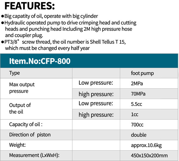 - پمپ های هیدرولیک پایی با فشار کاری 70 مگاپاسکال معادل 700 بار با حجم روغن 700 سی سی را برای انواع تجهیزات هیدرولیک استفاده نمایید دارای 2 متر شیلنگ و کوپلینگ قابل اتصال به تجهیزات هیدرولیک.