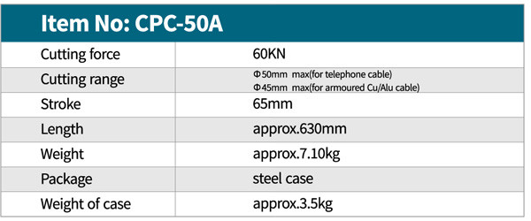 کابل بر هیدرولیک پمپ سرخود با قدرت 60 کیلونیوتن قابلیت برش کابل تلفن تا قطر 50 میلیمتر و کابل مس ، آلمینیوم و کابل زره دار تا قطر 45 میلیمتر را برش می دهد .
