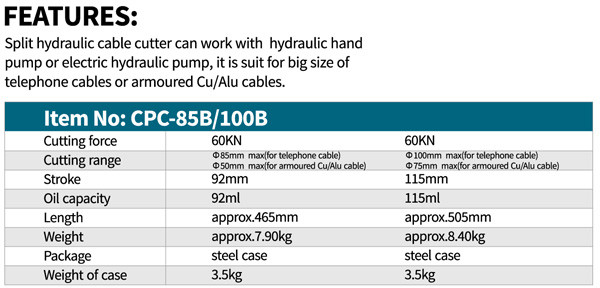 کلگی کابل بر هیدرولیک پمپ جدا با قدرت 60 کیلونیوتن قابلیت برش کابل مس و آلمینیوم کابل تلفن و ACSR تا قطر 100 میلیمتر و کابل مس و آلمینیوم زره دار ( مسلح ) و استیل چند رشته ای تا قطر 75 میلیتر