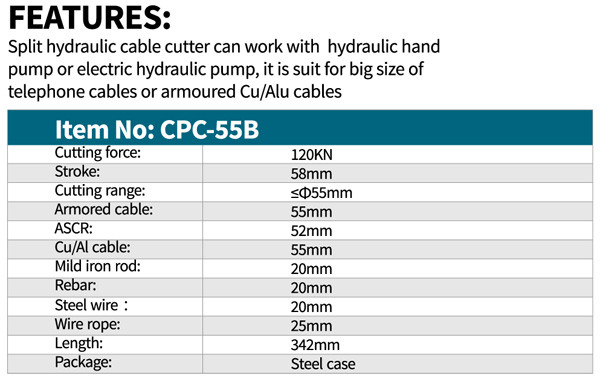 کابل بر هیدرولیک پمپ سرخود با قدرت 120 کیلونیوتن قابلیت برش کابل مس و آلمینیوم و زره دار تا قطر 55 میلیمتر برش ACSR تا قطر 52 میلیمتر و میله آهنی میلگرد سیم فولادی تا قطر 20 میلیمتر و طناب سیمی تا قطر 25 میلیمتر را برش می دهد .
