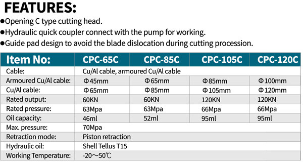 - کابل بر هیدرولیک پمپ سرخود با قدرت 120 کیلونیوتن قابلیت برش کابل مس و آلمینیوم تا قطر 120 میلیمتر و کابل مس و آلمینیوم زره دار تا قطر 100 میلیمتر