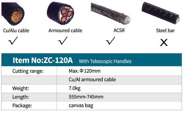 قابلیت برش کابل مس , آلمینیوم , ACSR و کابل زره دار ( مسلح ) تا قطر 120 میلیمتر را دارد و با دسته تلسکوپی و دسته ارگونومیک باعث آسان شدن کار میشود .