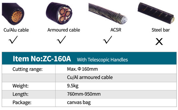 قابلیت برش کابل مس , آلمینیوم , ACSR و کابل زره دار ( مسلح ) تا قطر 160 میلیمتر را دارد و با دسته تلسکوپی و دسته ارگونومیک باعث آسان شدن کار میشود .