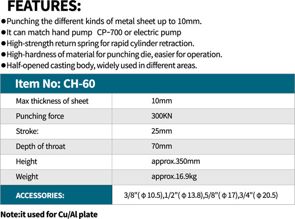 این پانچ همراه با سمبه های ۳/۸(10,5 میلی متر)، ۱/۲ (13,8 میلی متر)، ۵/۸ (17 میلی متر)، ۳/۴ (20,5 میلی متر) عرضه می گردد .سیلندر هیدرولیک داخلی این پانچ 30 تن و دارای کورس 25 میلی متر می باشد