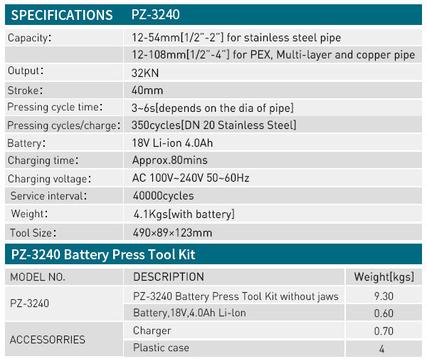 - قابلیت پرس لوله های pex و xpap از 12 الی 108 میلیمتر ( 1/2" تا 4" اینچ )