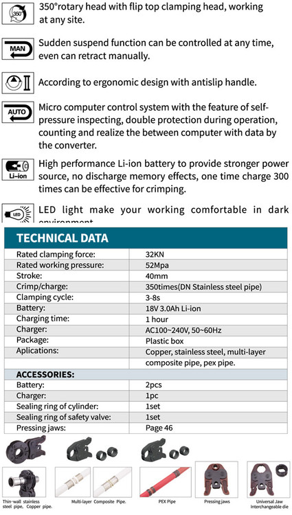 - قابلیت پرس کردن لوله پنج لایه ، لوله پکس PEX و xpap ، لوله های استنلس استیل و لوله های کامپوزیتی