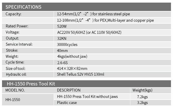 - قابلیت پرس لوله های استنلس استیل و لوله های مسی از 12 الی 54 میلیمتر ( 1/2" تا 2" اینچ )