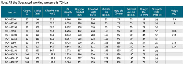جک های سری RCH (جک های وسط سوراخ) جک هایی با شفت سوراخدار می باشند که مناسب برای کشش و فشار نیرو هستند. و دارای عملکرد یکطرفه با برگشت فنری پرقدرت است.ظرفیت کاری آن در محدوده ی 12 تا 100 تن با کورس 8 الی 155 میلیمتر و فشار کاری 700 بار می باشد.