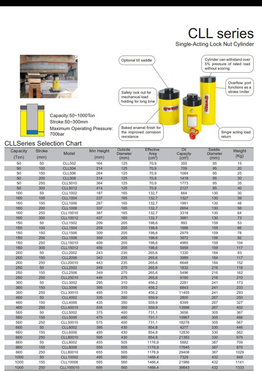 جک های سری CLL (جک های قفلی)جک هایی با ظرفیت بالا و دارای عملکرد یک طرفه و قابلیت برگشت با بار هستند ظرفیت کاری آن در محدوده 50 تا 1000 تن با کورس 30 میلیمتر الی 1000 میلی متر و فشار کاری 700 بار میباشد