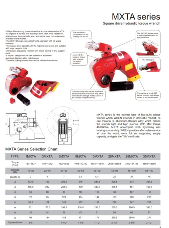 آچار هیدرولیک سری MXTA از سری آچار های بکس خور به حساب می آید . این آچار دارای درایو چهار گوش "۳/۴ الی "۱/۲-۲ می باشد .برای شرایط گشتاور سنگین مناسب است و در عملیات سفت کردن و باز کردن پیچ و مهره قابل استفاده است .