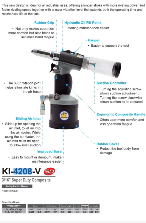 پرچ کن بادی مدل KI4208_V از نیروی باد به عنوان نیروی محرکه استفاده میکند این دستگاه هوای فشرده توسط یک کمپرسور باد مکیده و در مخزن ذخیره و فشرده میشود و با اعمال فشار بر میله ی پرچ آن را درون سوراخ تعبیه شده در دو قطعه فلزی فرو می برد در نهایت ساقه ی پرچ خم شده و اتصالی محکم و استوار را به ارمغان می آورد.