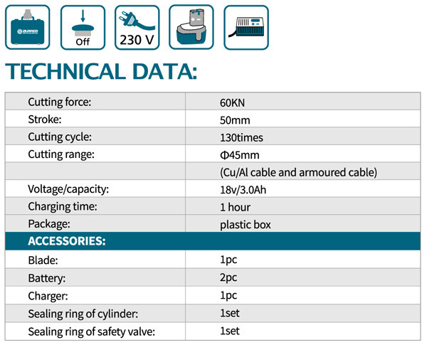 - این دستگاه قابلیت برش کابل مس و آلمینیوم و کابل مس و آلمینیوم زره دار را تا قطر 45 میلیمتر دارد