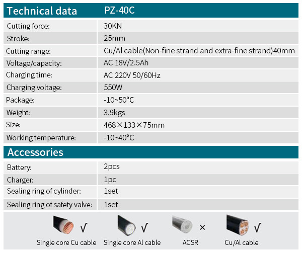 - این دستگاه قابلیت برش کابل مس و آلمینیوم و کابل مس و آلمینیوم زره دار را تا قطر 40 میلیمتر دارد